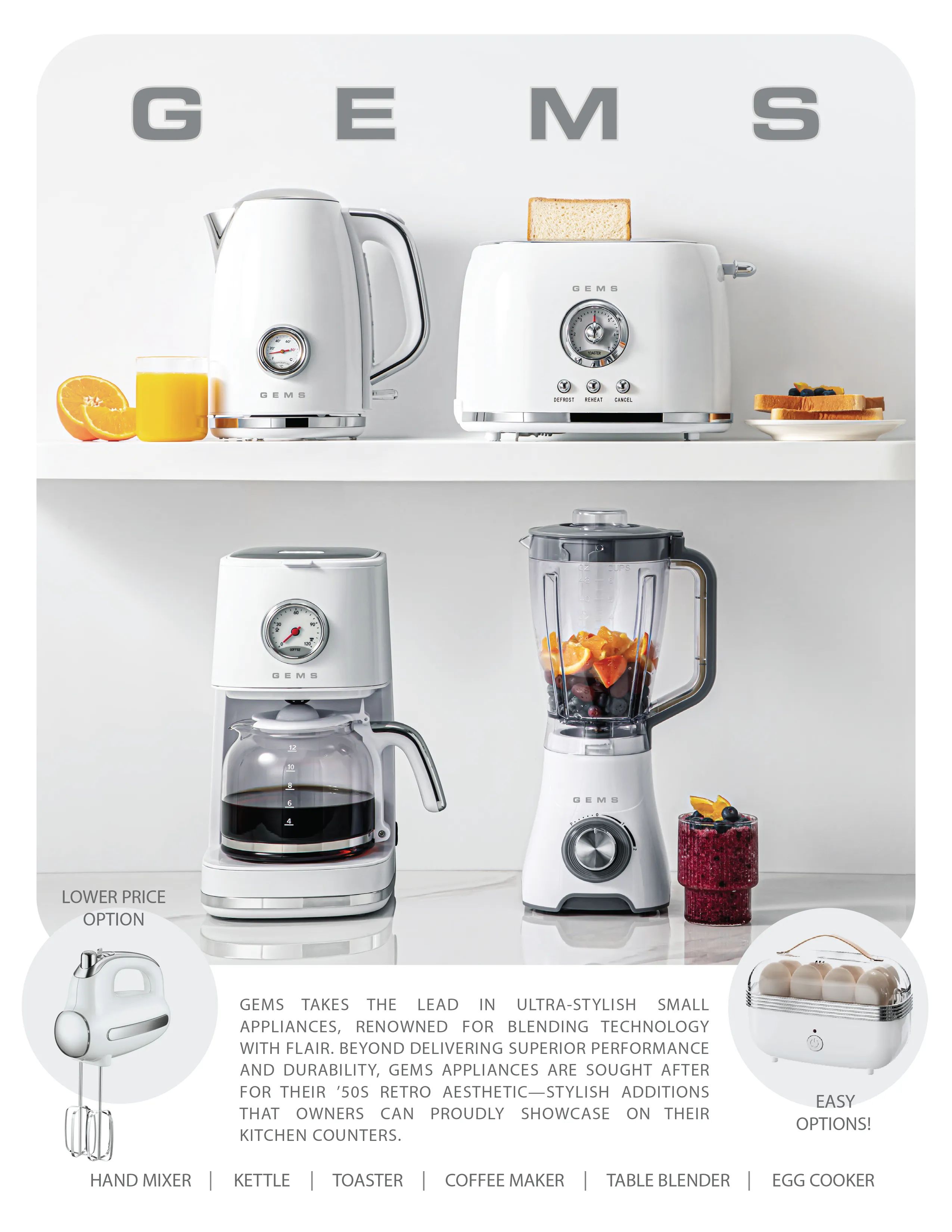 GEMS dominates the market for ultra-stylish small appliances, masterfully blending cutting-edge technology with distinctive flair. Renowned for exceptional performance and durability, GEMS appliances captivate with their iconic '50s retro aesthetic, transforming kitchens with vibrant colors and sleek designs. These coveted pieces are more than functional—they’re statement-making showpieces that owners proudly display on their countertops, elevating both style and practicality in any home.